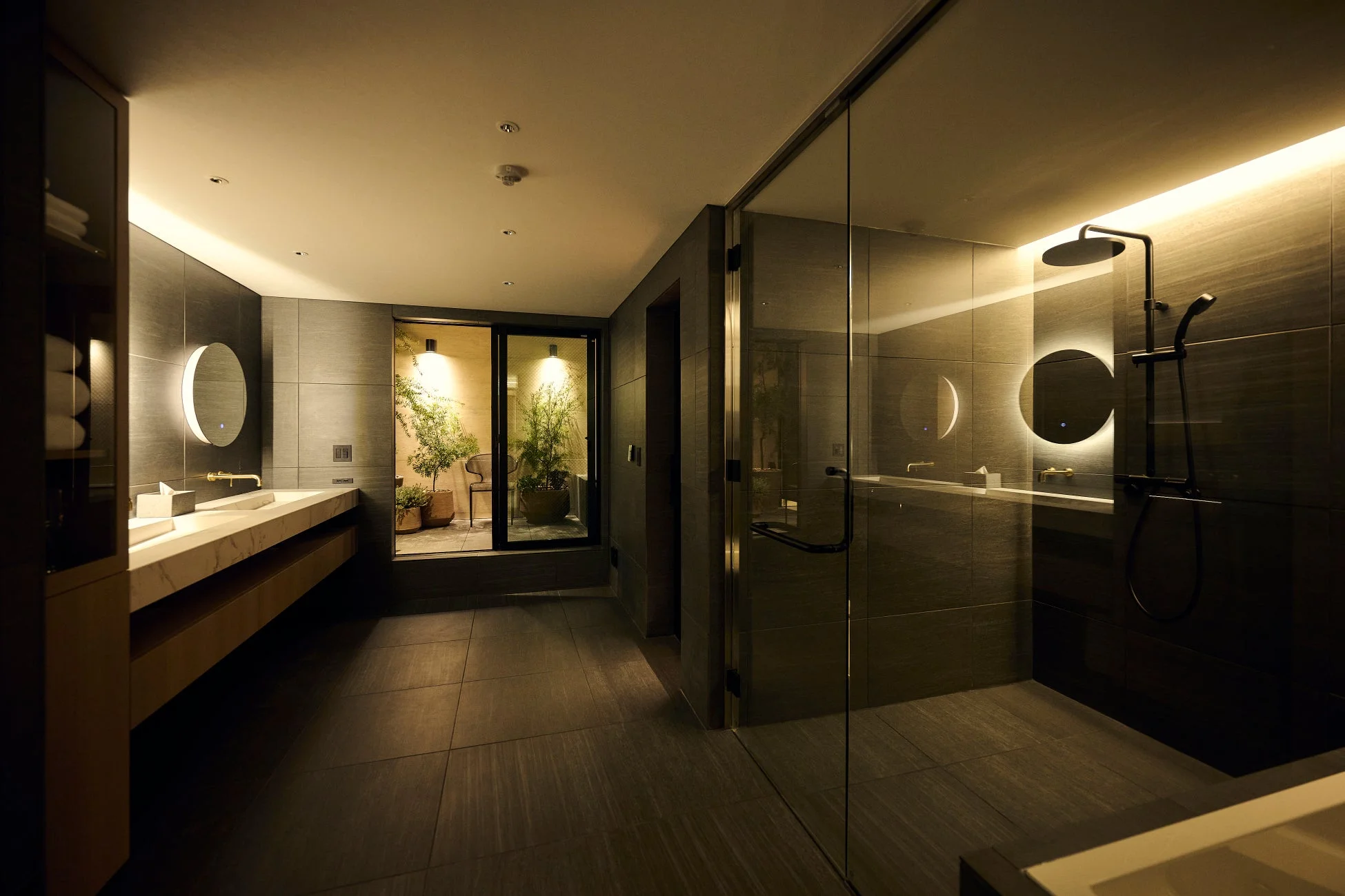 ととのい先輩:「都市の中心に身を置きながら、一度立ち止まり、自分自身を再起動するための『静寂の拠点』なんだ。壁には石材調の重厚な素材が使われ、木目調の天井が温かみを加えている。直線的な照明が空間に奥行きを与えていて、一歩足を踏み入れただけで、外界の気配がすっと遮断されるのを感じないか?」